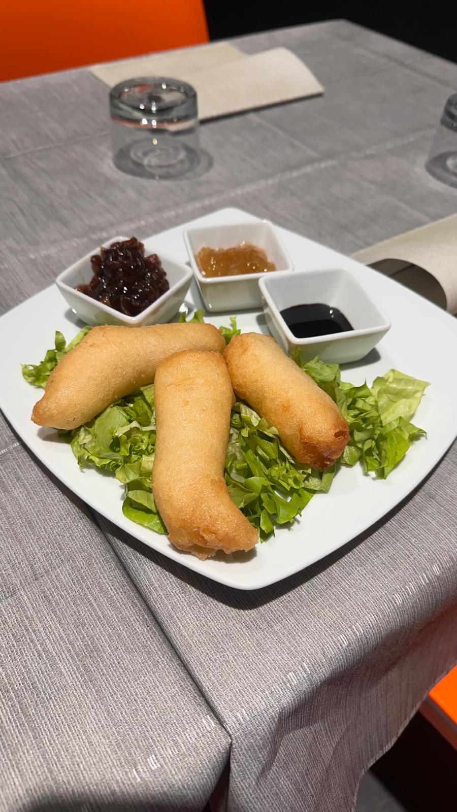 Pepite di baccalà impanate, servite su letto di insalata julienne, 3 salse per giocare con i sapori, confettura di fichi, glassa di aceto balsamico, cipolle caramellate, sposa bene come antipasto e secondo